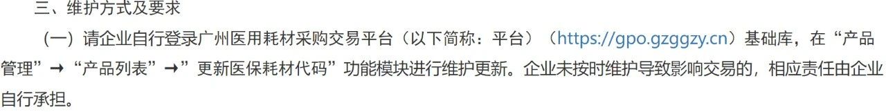 企業(yè)須對維護及提交信息的真實性、有效性、合法性負責。對提交及填報虛假信息的企業(yè),一經(jīng)查實或經(jīng)舉報核實,平臺將如實向有關監(jiān)管機構報送并按照招采信用制度進行評級,由此產(chǎn)生的相應責任由企業(yè)自行承擔。對于未按時維護耗材醫(yī)保編碼的企業(yè)相關產(chǎn)品暫不予掛網(wǎng)交易。