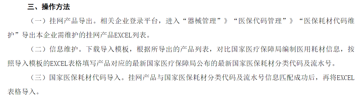 此次通知中并未給出具體的截止時間,但明確提出,已在平臺中掛網(wǎng)的醫(yī)用耗材,企業(yè)應及時做好醫(yī)保代碼維護工作。如后續(xù)國家醫(yī)療保障局公示新批次國家醫(yī)保醫(yī)用耗材分類與代碼數(shù)據(jù)信息,此項工作繼續(xù)進行。