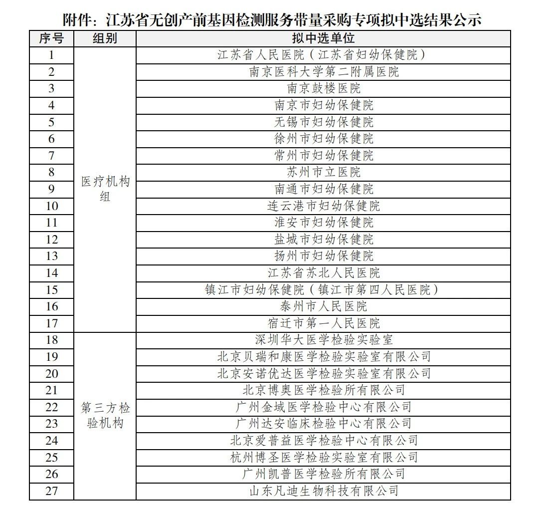 10月18日,江蘇省無創(chuàng)產前基因檢測服務帶量采購專項擬中選結果公示。