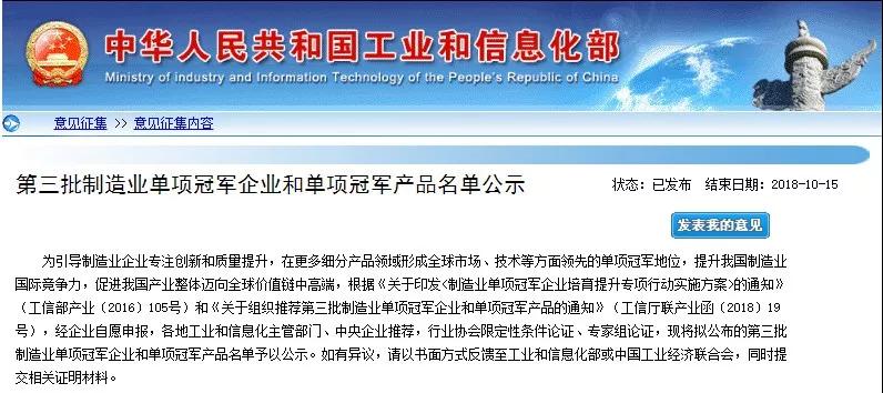 10月8日,中華人民共和國工業(yè)和信息化部對(duì)《第三批制造業(yè)單項(xiàng)冠軍企業(yè)和單項(xiàng)冠軍產(chǎn)品名單》進(jìn)行公示。