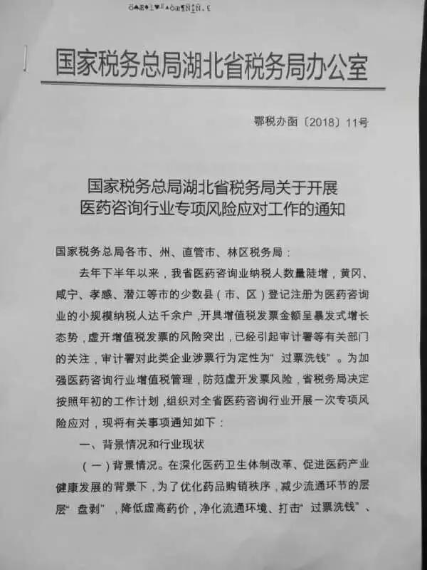 近日,業(yè)內(nèi)流傳一份國家稅務(wù)總局湖北省稅務(wù)局發(fā)布的《關(guān)于開展醫(yī)藥咨詢行業(yè)專項風(fēng)險應(yīng)對工作的通知》(以下簡稱《通知》)。(原文件見附件)