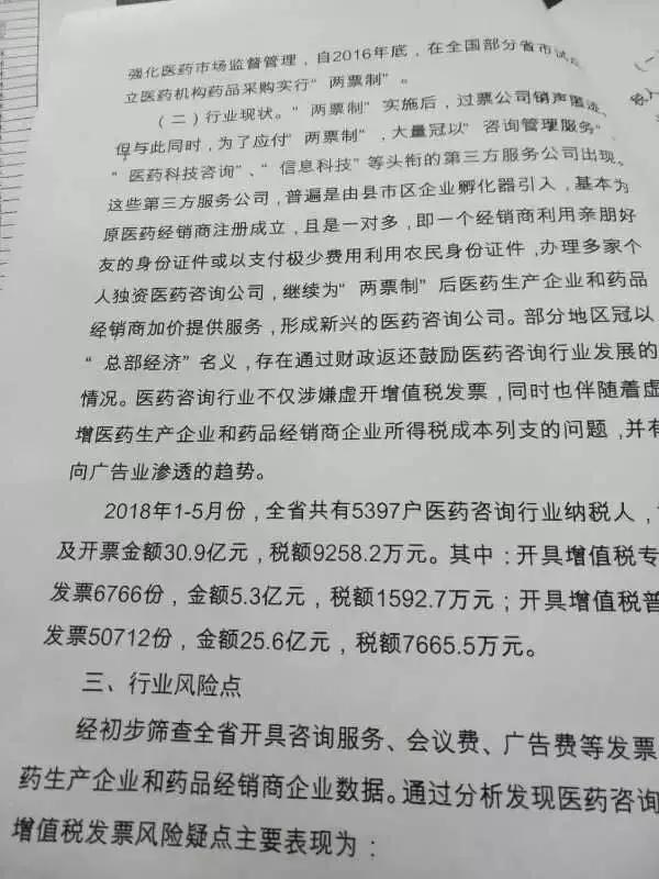 醫(yī)藥咨詢行業(yè)不僅涉嫌虛開增值稅發(fā)票, 同時也伴著虛增醫(yī)藥生產(chǎn)企業(yè)和藥品經(jīng)銷商企業(yè)所得稅成本列支的問題,并有向廣告業(yè)滲透的趨勢。