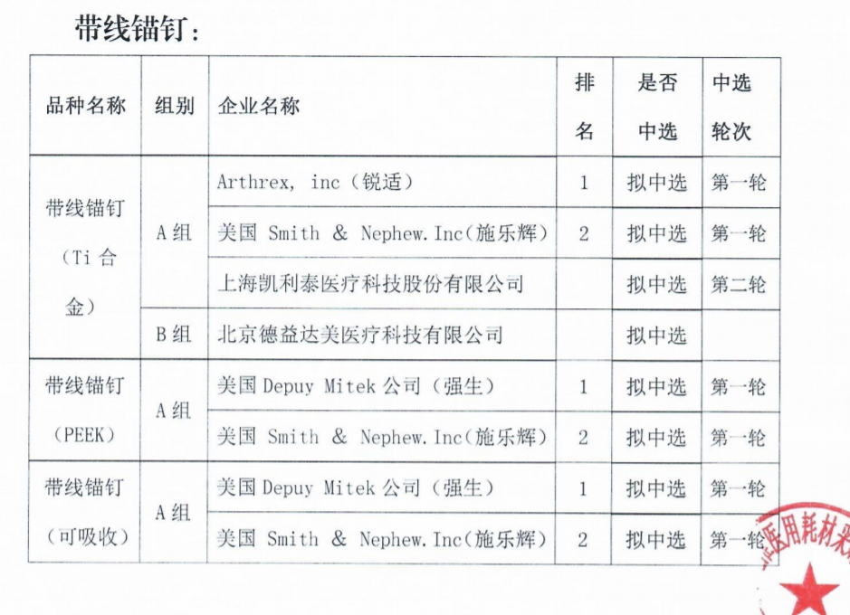 帶線錨釘擬中選企業(yè)包括強(qiáng)生、施樂輝、銳適等;