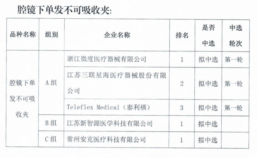腔鏡下單發(fā)不可吸收夾擬中選企業(yè)包括浙江微度、江蘇三聯(lián)星海、泰利福等。