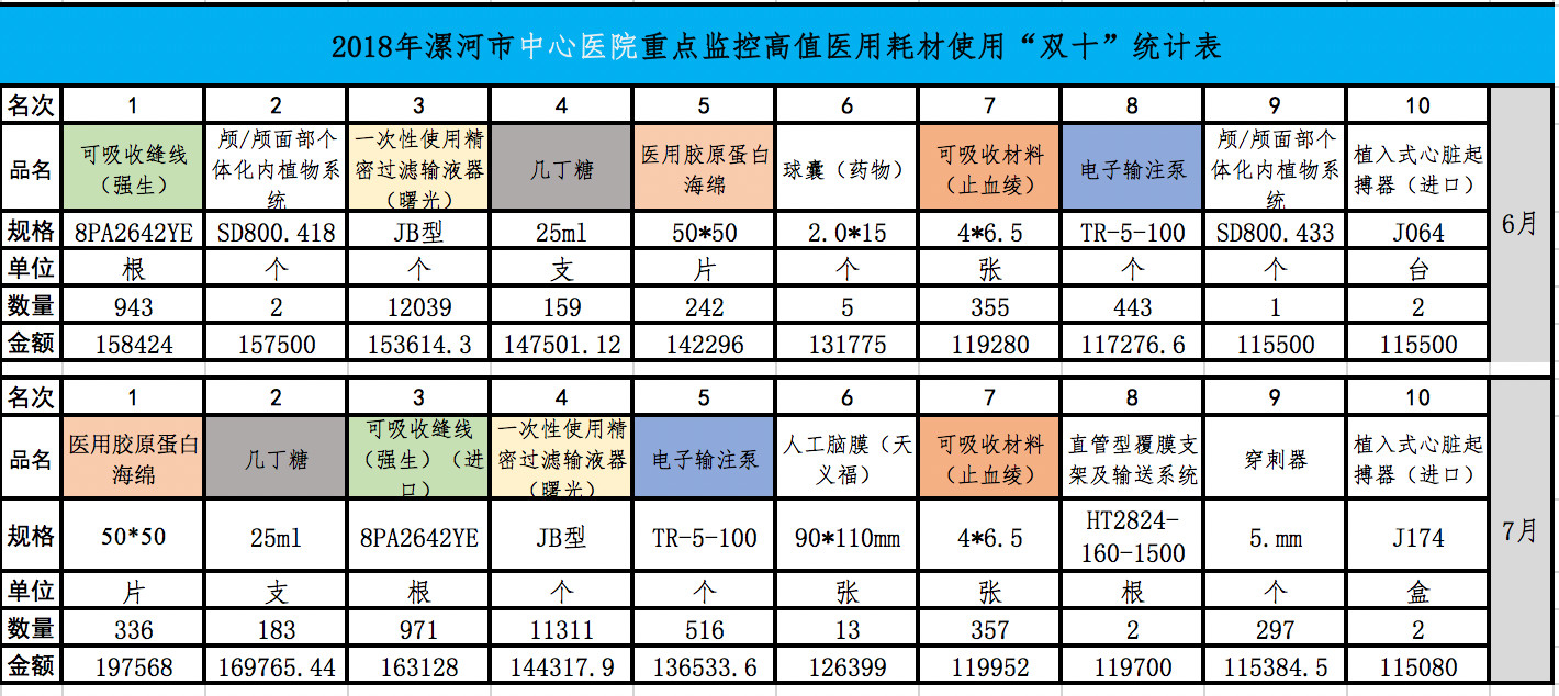 近日,河南省漯河市衛(wèi)生計生委員會發(fā)布《關于12家城市公立醫(yī)院2018年6-7月高值醫(yī)用耗材雙十排名情況的通知》(下稱《通知》),曝光了全國首份醫(yī)院耗材用量連續(xù)兩個月排名前十的名單,以及耗材使用量大的醫(yī)務人員。