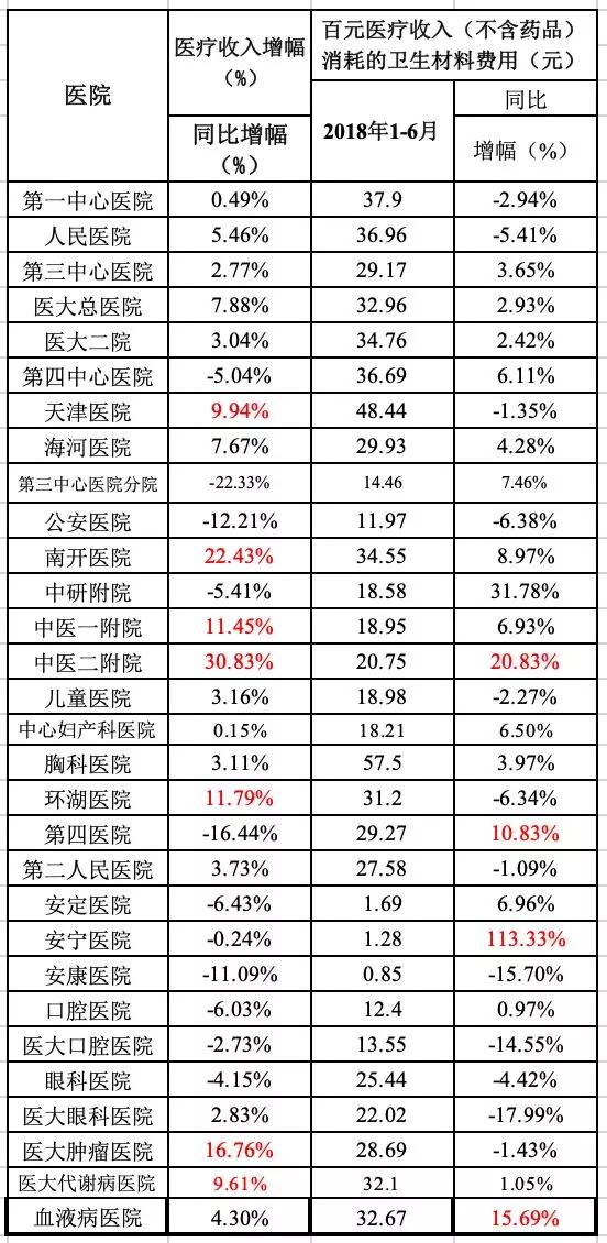 根據(jù)公示的數(shù)據(jù), 2018年上半年,天津市30家公立醫(yī)院的醫(yī)療費用較去年同期平均增長2.18%,百元醫(yī)療收入(不含藥品)消耗的衛(wèi)生材料費用較去年同期平均增長為5.83%。