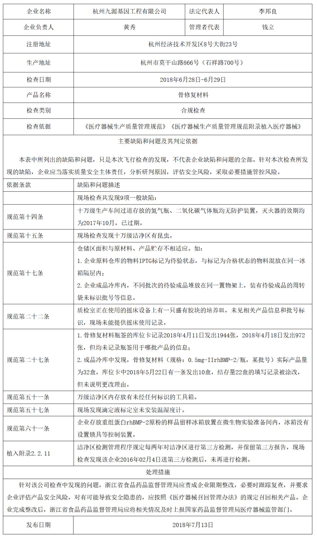 對杭州九源基因工程有限公司飛行檢查通報