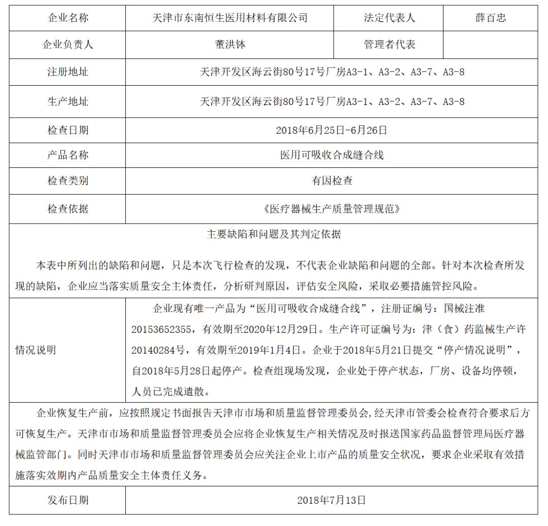 對天津市東南恒生醫(yī)用材料有限公司飛行檢查通報