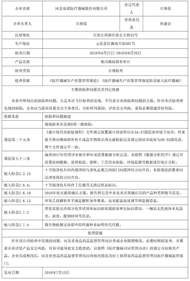 對河北瑞諾醫(yī)療器械股份有限公司飛行檢查通報