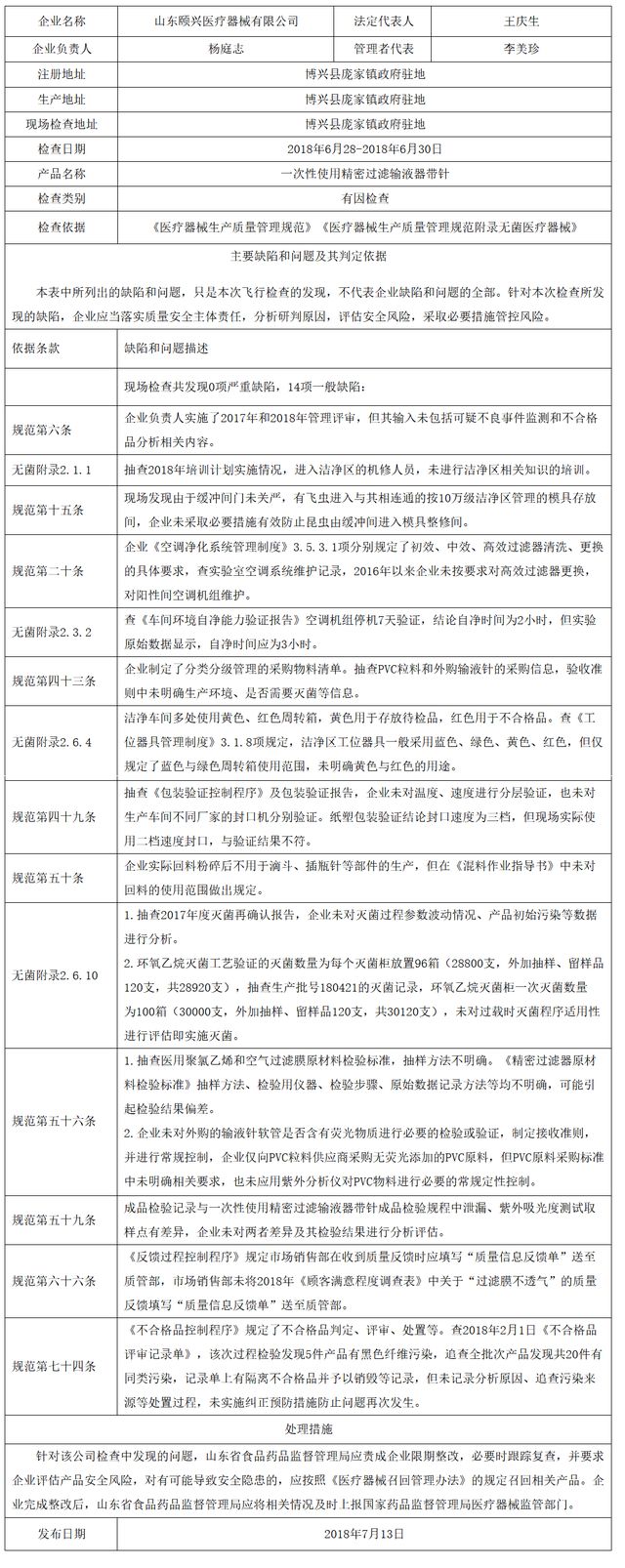 對山東頤興醫(yī)療器械有限公司飛行檢查通報