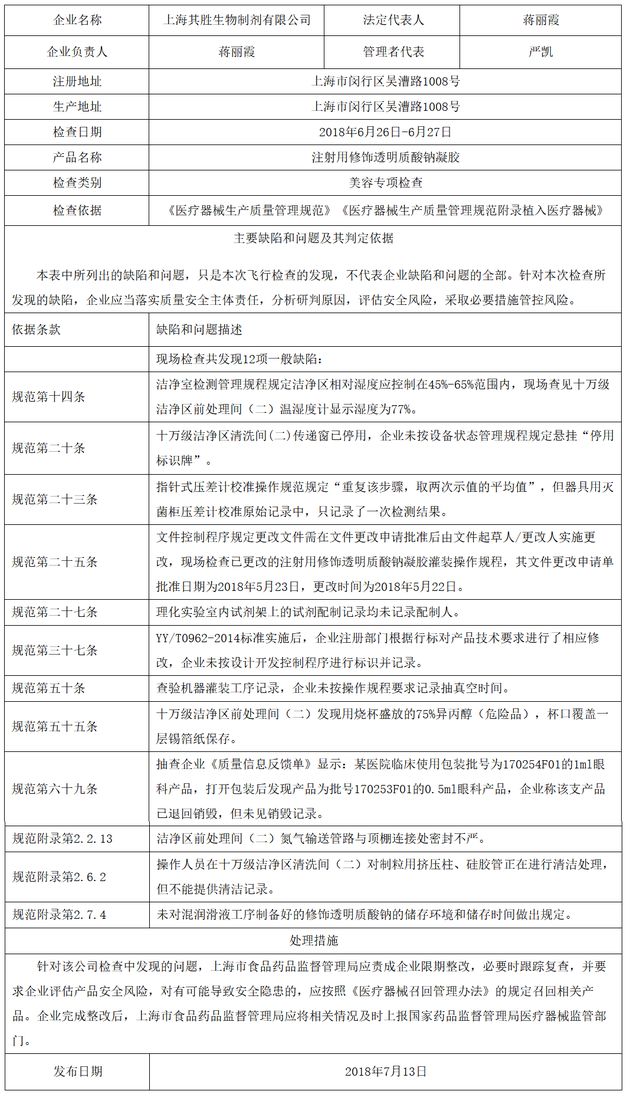 對上海其勝生物制劑有限公司飛行檢查通報