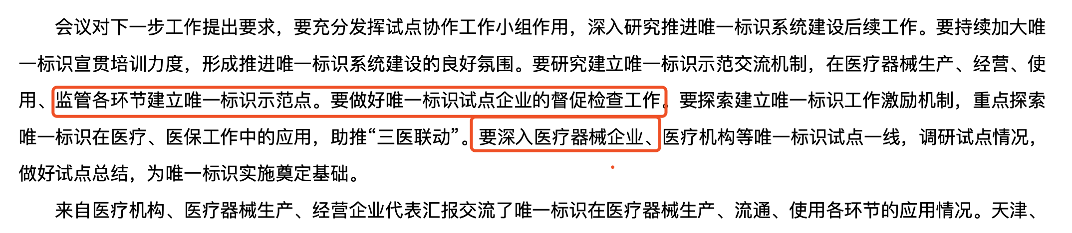 國家將繼續(xù)推進唯一標識系統(tǒng)建設(shè)后續(xù)工作,建立唯一標識示范交流機制,在醫(yī)療器械生產(chǎn)、經(jīng)營、使用、監(jiān)管各環(huán)節(jié)建立唯一標識示范點。做好唯一標識試點企業(yè)的督促檢查工作。