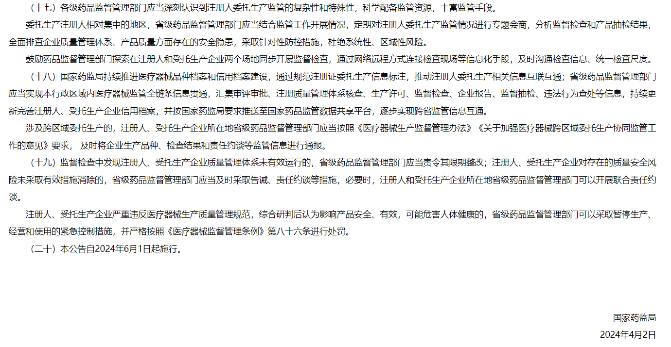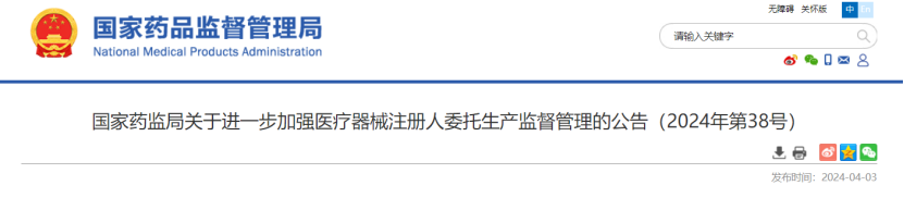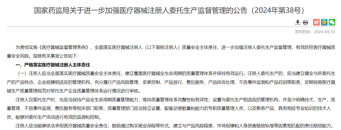 近日,國家藥監(jiān)據發(fā)布《國家藥監(jiān)局關于進一步加強醫(yī)療器械注冊人委托生產監(jiān)督管理的公告(2024年第38號)》(以下簡稱《公告》),公告自2024年6月1日起施行(文末附全文)。