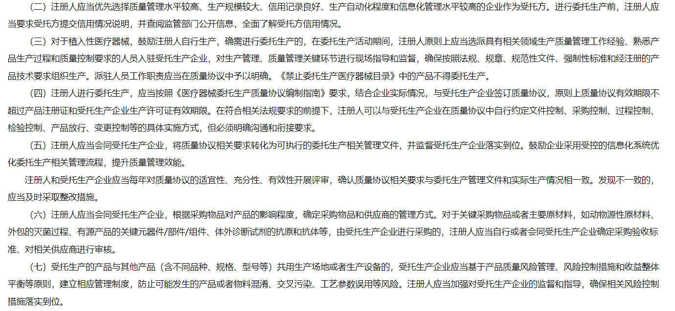 根據《公告》,注冊人委托生產的,應當建立健全與所委托生產的產品特點、企業(yè)規(guī)模相適應的管理機構,充分履行產品風險管理、變更控制、產品放行、售后服務、產品投訴處理、不良事件監(jiān)測和產品召回等職責,定期按照醫(yī)療器械生產質量管理規(guī)范對受托生產企業(yè)質量管理體系運行情況進行審核。