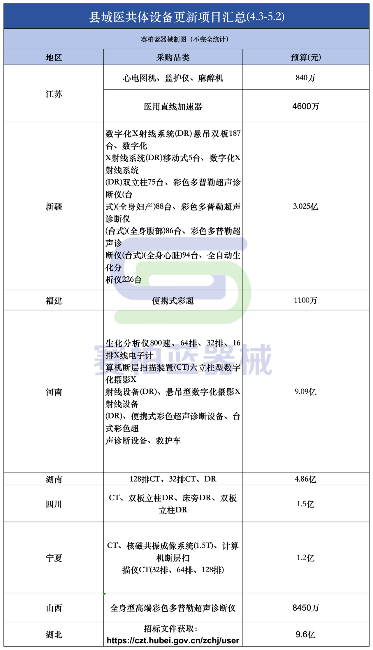 賽柏藍(lán)器械查詢發(fā)現(xiàn),僅近一個(gè)月內(nèi),中國政府采購網(wǎng)關(guān)于“縣域醫(yī)共體”的醫(yī)療設(shè)備相關(guān)招采就有近50個(gè),包括浙江、黑龍江、山西、四川、江蘇、新疆、河南、福建、寧夏、湖北、山東等地。