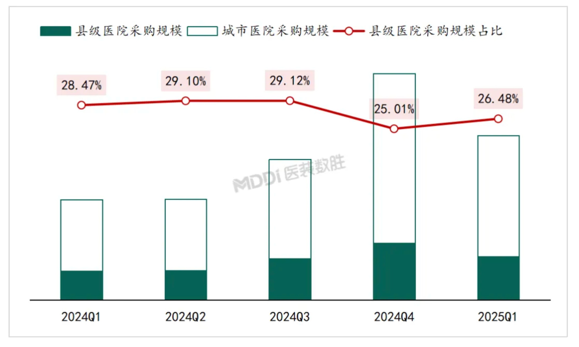 (2024-2025年3月國內(nèi)公立醫(yī)院醫(yī)療設(shè)備采購規(guī)模及縣級(jí)醫(yī)院占比季度變化)