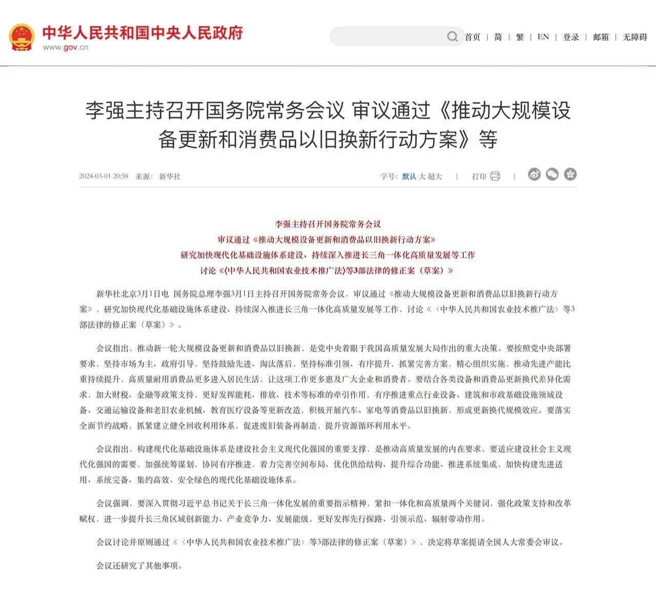 新華社報道,國務(wù)院總理李強3月1日主持召開國務(wù)院常務(wù)會議,審議通過《推動大規(guī)模設(shè)備更新和消費品以舊換新行動方案》,研究加快現(xiàn)代化基礎(chǔ)設(shè)施體系建設(shè)、持續(xù)深入推進長三角一體化高質(zhì)量發(fā)展等工作,討論《〈中華人民共和國農(nóng)業(yè)技術(shù)推廣法〉等3部法律的修正案(草案)》。
