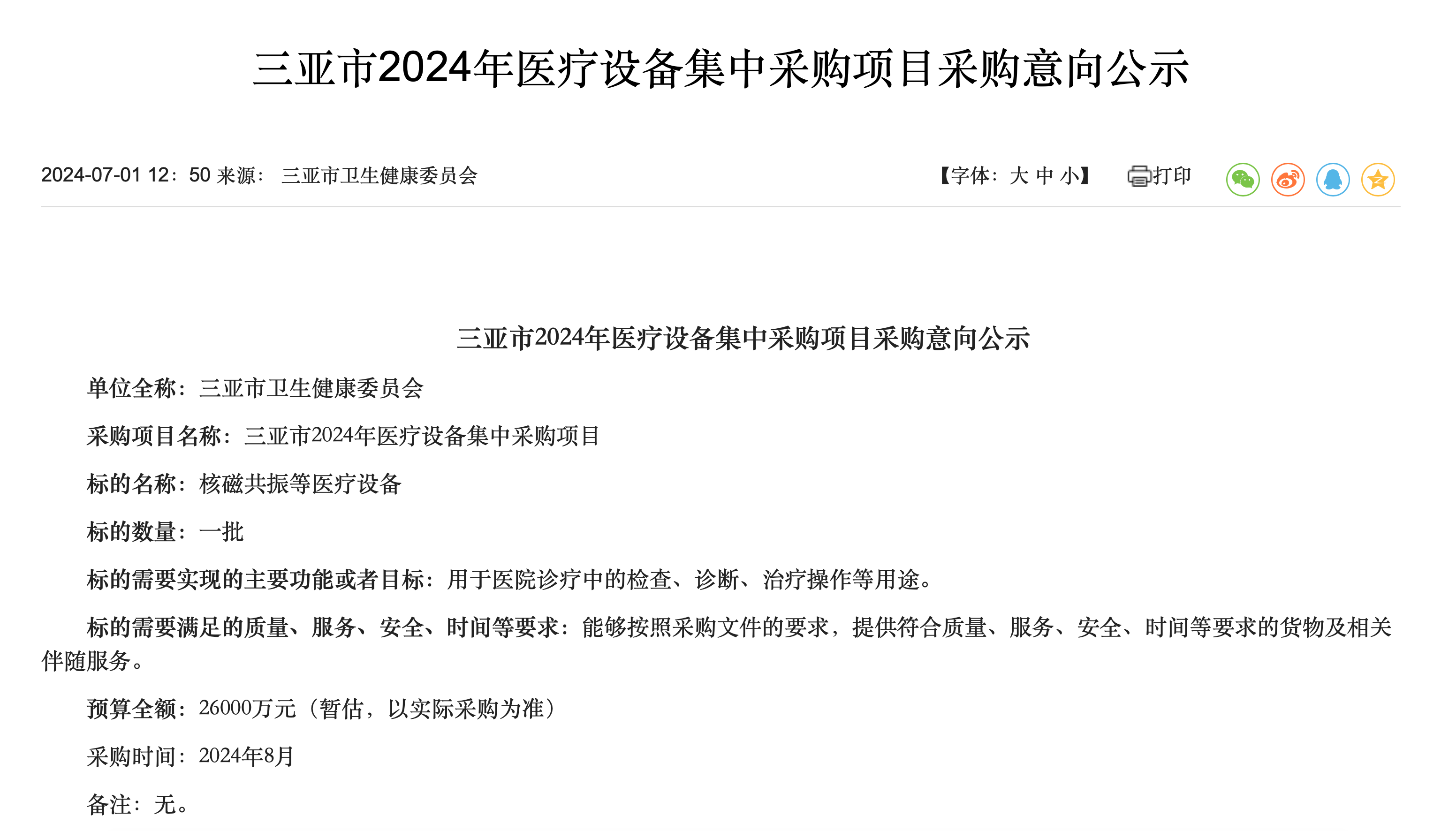 根據(jù)公示,三亞市衛(wèi)生健康委員會將在2024年8月采購一批核磁共振等醫(yī)療設(shè)備,預(yù)算全額26000萬元(暫估,以實(shí)際采購為準(zhǔn))。