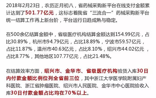 先是2月初,醫(yī)用耗材采購(gòu)新平臺(tái)6家三甲醫(yī)院試點(diǎn)成功,并明確下一步就要在浙江省內(nèi)進(jìn)行全面推廣!而就在昨天,浙江省藥械采購(gòu)網(wǎng)又發(fā)布消息,三流合一新平臺(tái)在線支付金額累計(jì)達(dá)到了501.77億元,醫(yī)院30天回款超70%!