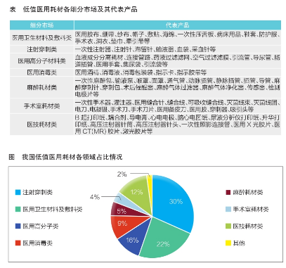 低值醫(yī)用耗材主要是指醫(yī)療機構在開展醫(yī)療服務過程中經(jīng)常使用的一次性衛(wèi)生材料(如紗布、棉簽、手套、注射器等),可以細分為醫(yī)用衛(wèi)生材料及敷料類、注射穿刺類、醫(yī)用高分子材料類、醫(yī)用消毒類、麻醉耗材類、手術室耗材類和醫(yī)技耗材類(低值醫(yī)用耗材細分市場及其代表產(chǎn)品見表)。