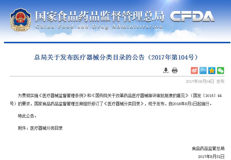 距CFDA發(fā)布新版《醫(yī)療器械分類目錄》過去了將近1年的緩沖時間,按照之前的公示:新版《醫(yī)療器械分類目錄》將在2018年8月1日正式實施。