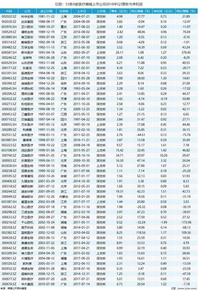 近期,隨著A股市場先后披露2018年第三季度報告,國內(nèi)上市企業(yè)醫(yī)療器械業(yè)績版圖呼之欲出。通過Choice金融終端檢索的數(shù)據(jù),制成A股醫(yī)療器械上市公司Q3營收與凈利潤信息一覽表,以期窺見行業(yè)發(fā)展現(xiàn)狀。