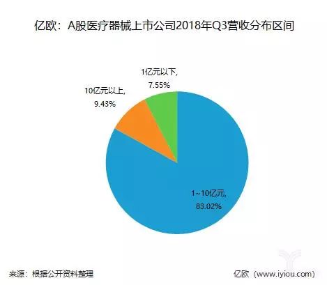 將A股醫(yī)療器械上市公司2018年Q3營收分為三個區(qū)間,分別是1億元以下、1~10億元、10億元以上,對應(yīng)的占比為依次為7.55%(4家)、83.02%(44家)、9.43%(5家)。其中,1~10億元區(qū)間里,營收范圍在1~5億元的企業(yè)有36家??傮w而言,各區(qū)間之間呈現(xiàn)明顯的梯度差異。