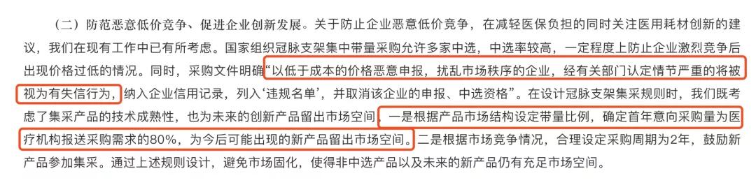 關(guān)于防止企業(yè)惡意低價競爭,在減輕醫(yī)保負擔(dān)的同時關(guān)注醫(yī)用耗材創(chuàng)新的建議,在現(xiàn)有工作中已有所考慮。國家組織冠脈支架集中帶量采購允許多家中選,中選率較高,一定程度上防止企業(yè)激烈競爭后出現(xiàn)價格過低的情況。同時,采購文件明確“以低于成本的價格惡意申報,擾亂市場秩序的企業(yè),經(jīng)有關(guān)部門認定情節(jié)嚴重的將被視為有失信行為,納入企業(yè)信用記錄,列入‘違規(guī)名單’,并取消該企業(yè)的申報、中選資格”。