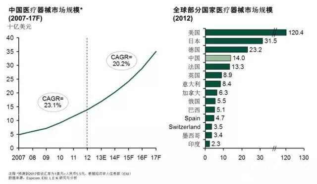 和醫(yī)藥市場一樣,中國醫(yī)療器械市場在過去一直保持著快速增長,并且被很多人認(rèn)為是“后勁”更足的一塊。中國市場在2012年就已經(jīng)是全球第四大醫(yī)療器械市場,市場規(guī)模達(dá)到140億美元,并且行業(yè)內(nèi)大多認(rèn)同還能在相當(dāng)一段時間內(nèi)維持20%以上的增長。按照這種趨勢下去,中國很快就有望成為全球第二大醫(yī)療器械市場。