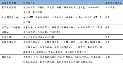 醫(yī)療器械產(chǎn)品種類繁多,主要分為以下六大類:家用醫(yī)療器械、大中型醫(yī)療設(shè)備、植(介)入性等高端器械、潔凈手術(shù)室和消毒供應中心等醫(yī)療工程、常規(guī)醫(yī)用耗材、制藥設(shè)備。