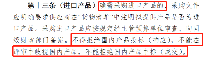并且,不得拒絕國(guó)內(nèi)產(chǎn)品投標(biāo)、響應(yīng),不能在評(píng)審中歧視國(guó)內(nèi)產(chǎn)品,不能拒絕國(guó)內(nèi)產(chǎn)品中標(biāo)、成交。