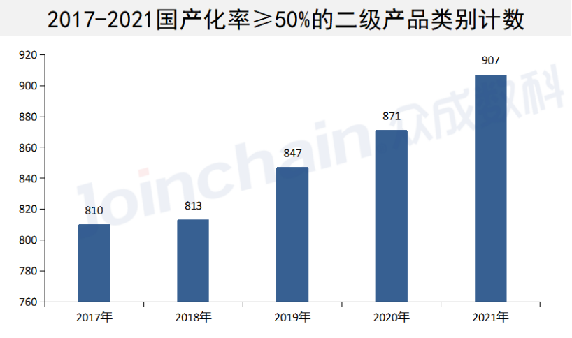 截至2021年底,國內可分類的1083項二級品類中,國產化率為0%的二級產品類別共52項,國產化率為0-40%的二級產品類別共88項,國產化率為40-70%的二級產品類別共215項,國產化率70%以上的二級產品類別共728項。