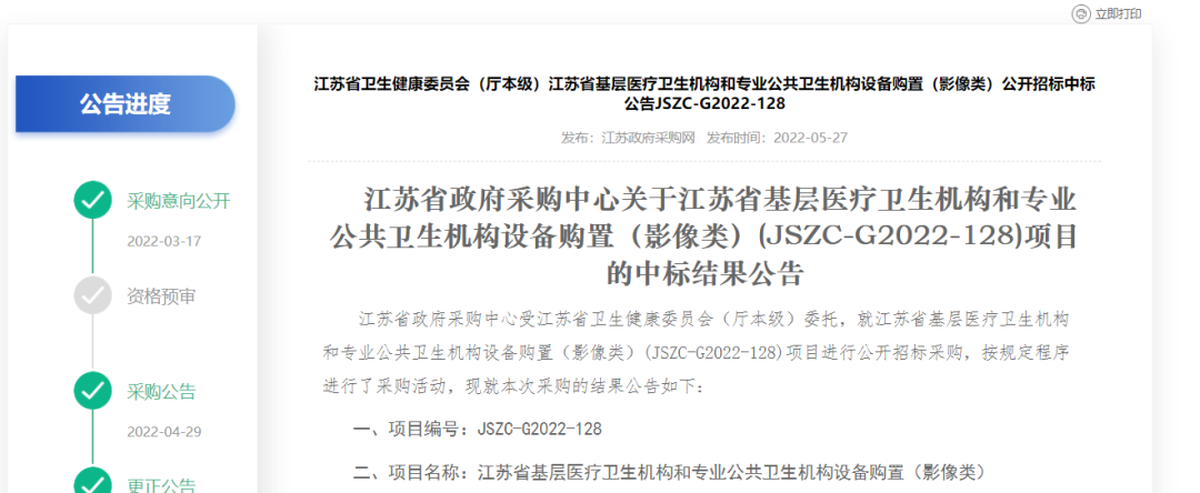 5月27日,《江蘇省基層醫(yī)療衛(wèi)生機(jī)構(gòu)和專業(yè)公共衛(wèi)生機(jī)構(gòu)設(shè)備購(gòu)置(影像類)公開(kāi)招標(biāo)中標(biāo)公告》公布,257臺(tái)DR、彩超...總預(yù)算高達(dá)1億元的設(shè)備采購(gòu)大單最終中標(biāo)結(jié)果公布!