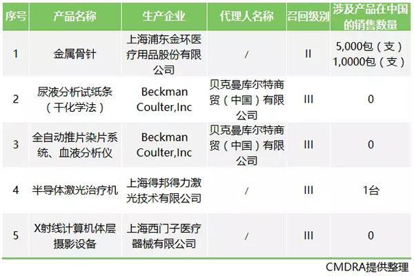 近期,國家食品藥品監(jiān)督管理總局發(fā)布一批召回信息,共涉及5個產(chǎn)品。其中包括1項II級召回,4項III級召回。詳情如下: