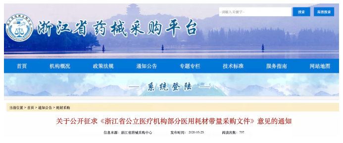 (5月25日),浙江省藥械采購中心根據(jù)浙江省醫(yī)療保障局《浙江省公立醫(yī)療機構部分醫(yī)用耗材帶量采購工作方案(征求意見稿)》,擬訂了《浙江省公立醫(yī)療機構部分醫(yī)用耗材帶量采購文件(征求意見稿)》。