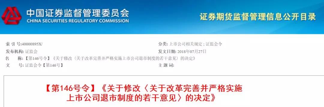 7月27日晚間,中國證監(jiān)會發(fā)布《關于修改<關于改革完善并嚴格實施上市公司退市制度的若干意見>的決定》(以下簡稱《決定》)。在公眾健康安全等領域的重大違法行為的上市公司,要強制退市!