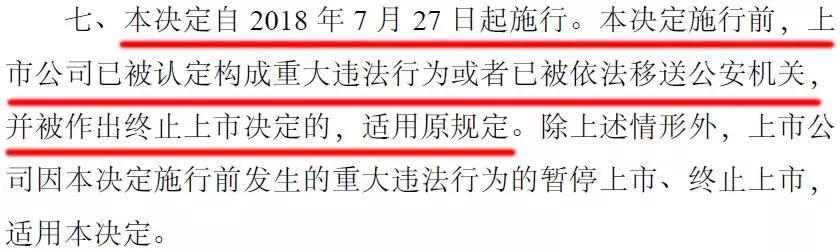 證監(jiān)會表示,本《決定》施行前,上市公司已被認定構成重大違法行為或者已被依法移送公安機關,并被作出終止上市決定的,適用原規(guī)定。除上述情形外,上市公司因本決定施行前發(fā)生的重大違法行為的暫停上市、終止上市,適用本決定。