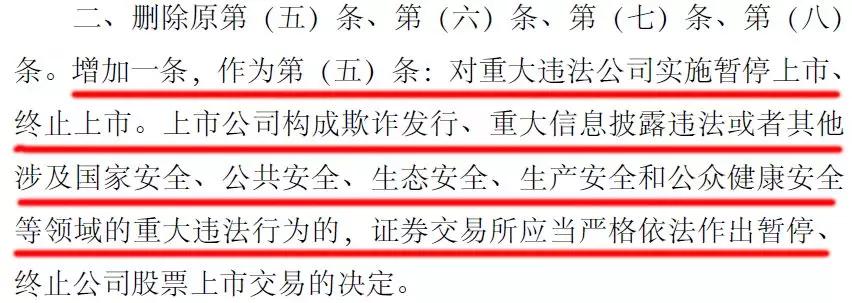 證監(jiān)會對退市制度的修改,最重要的一條就是明確了,上市公司涉及到公共安全、生態(tài)安全、生產安全和公眾健康安全等領域的重大違法行為的,證券交易所應當嚴格依法作出暫停、終止公司股票上市交易決定。