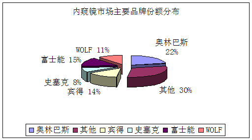 外資品牌從產(chǎn)品、技術(shù)到服務(wù)都占據(jù)絕對的優(yōu)勢,其中奧林巴斯(22%)、賓得(14%)、富士能(15%)、卡爾史托斯、WOLF(11%)以及史賽克(8%)6大品牌占據(jù)了主導(dǎo)地位。國內(nèi)品牌雖然在價格上占有優(yōu)勢,但技術(shù)水平仍然是軟肋,加之銷售渠道的開拓能力也無法與外資品牌媲美,因此市場占有率很低。