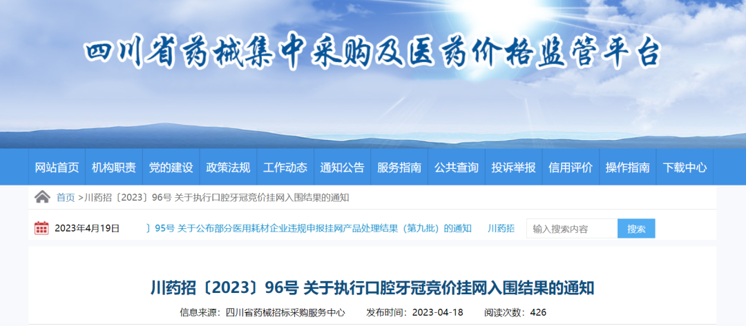 4月19日,四川省藥械招標采購服務中心發(fā)布關于《川藥招〔2023〕96號 關于執(zhí)行口腔牙冠競價掛網(wǎng)入圍結果的通知》(簡稱《通知》)。