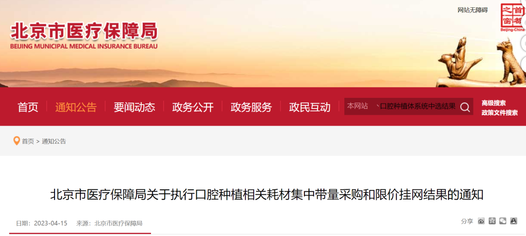 4月15日,北京市醫(yī)保局官網(wǎng)發(fā)布《北京市醫(yī)療保障局關于執(zhí)行口腔種植相關耗材集中帶量采購和限價掛網(wǎng)結果的通知》,公布了北京市口腔種植體系統(tǒng)中選結果,自4月20日,各中選企業(yè)、配送企業(yè)、醫(yī)療機構簽訂三方協(xié)議,執(zhí)行網(wǎng)上采購。