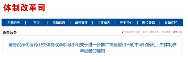 而國務(wù)院醫(yī)改領(lǐng)導(dǎo)小組也緊接著發(fā)布了《關(guān)于進(jìn)一步推廣福建省和三明市深化醫(yī)藥衛(wèi)生體制改革經(jīng)驗(yàn)的通知》。要求全國各省市“進(jìn)一步推廣福建省和三明市醫(yī)改經(jīng)驗(yàn)的重點(diǎn)任務(wù)”。其中明確要求: