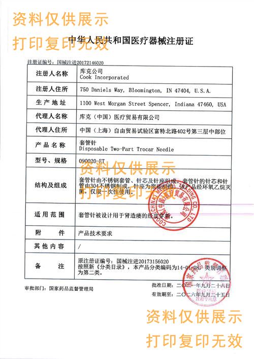 美國cook套管針用于B超或X-射線導引下,經(jīng)皮腎臟穿刺導入腎造瘺器械或其他治療器械,進行腎盂引流或建立進入腎盂的通道。